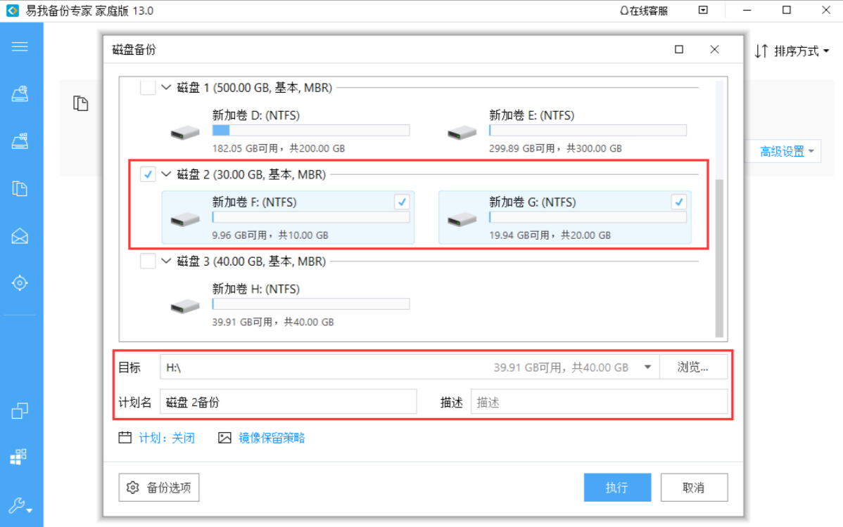 2、選擇需要備份的磁盤/卷,設置好備份計劃名稱、描述以及備份鏡像文件存放的目標路徑(備份完成會生成.pbd格式的鏡像文件)。