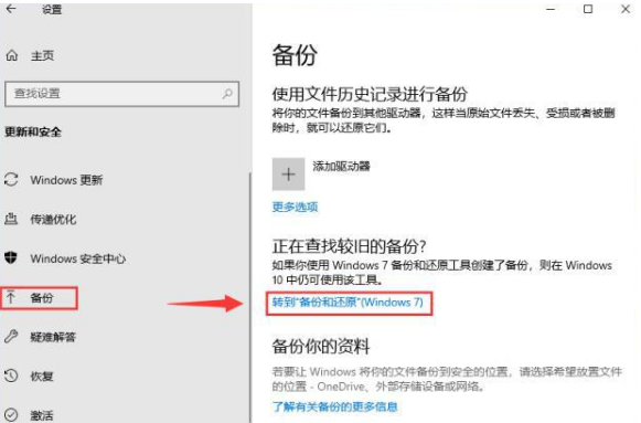 2、點擊左側備份,然后點擊添加驅動器,選擇需要備份到哪個磁盤。接著就開始備份了。