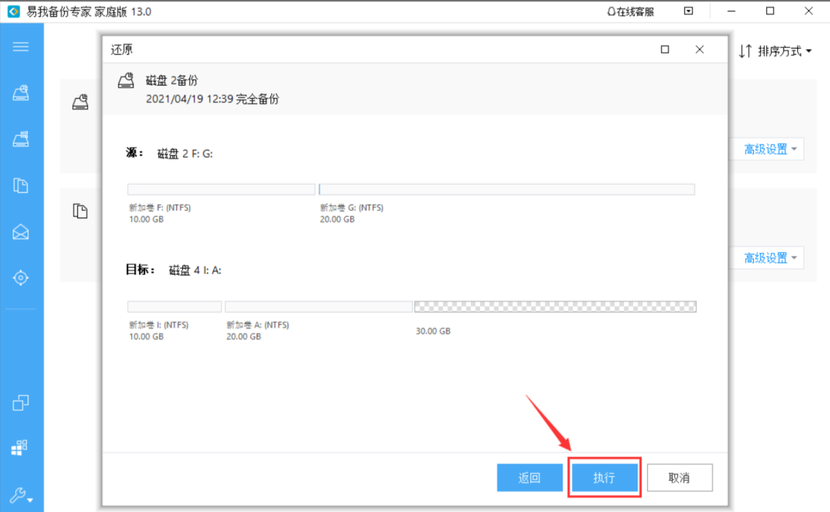 8、設置還原到的目標磁盤,點擊“執行”以完成磁盤/卷還原。