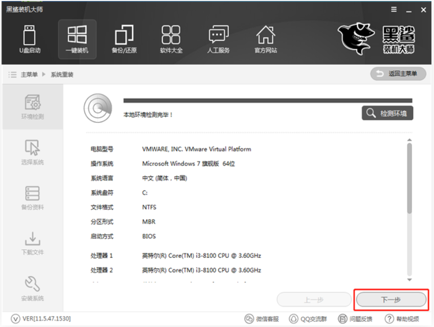 2、點擊系統重裝后,黑鯊裝機大師會為我們進行環境檢測,顯示電腦配置。黑鯊裝機大師會給我們推薦安裝的系統。檢測環境完成后,點擊“下一步”。