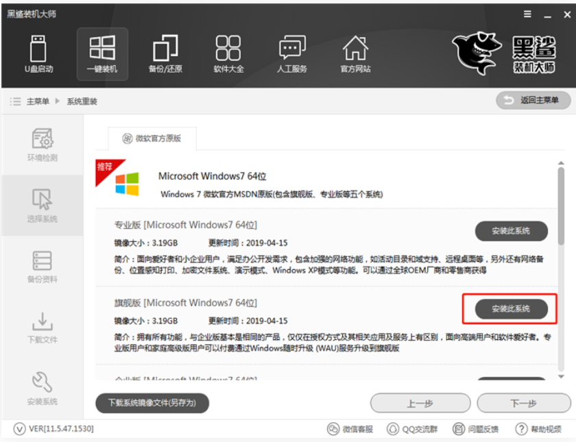 3、黑鯊裝機大師為我們提供了“微軟官方原版”系統,各個時期的版本皆有,大家可根據需要自由選擇。小編在這里選擇了win7 64位旗艦版系統。