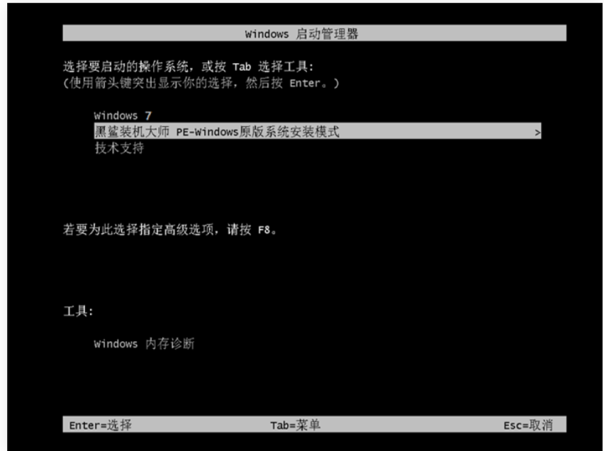 6、下載完成后,電腦會自動重啟。黑鯊裝機大師在計算機的開機啟動菜單中,會自動添加黑鯊PE原版系統安裝模式,重啟后會默認進入PE安裝電腦系統。進入PE模式后,黑鯊裝機大師會加載文件并部署系統,我們需要等待幾分鐘。