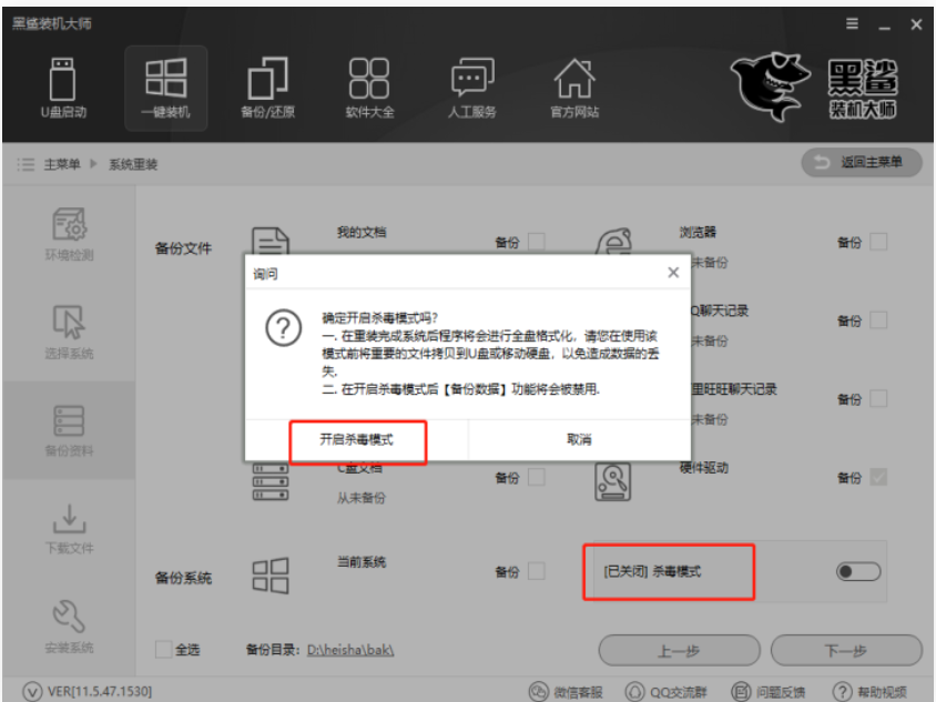 開啟殺毒模式進行重裝系統,就不能進行系統備份,所以重要文件要在之前進行保存。