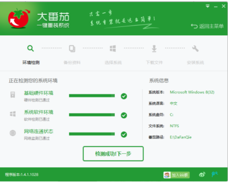 1、下載安裝大番茄一鍵重裝系統并打開,點擊“立即重裝系統”進入環境檢測。