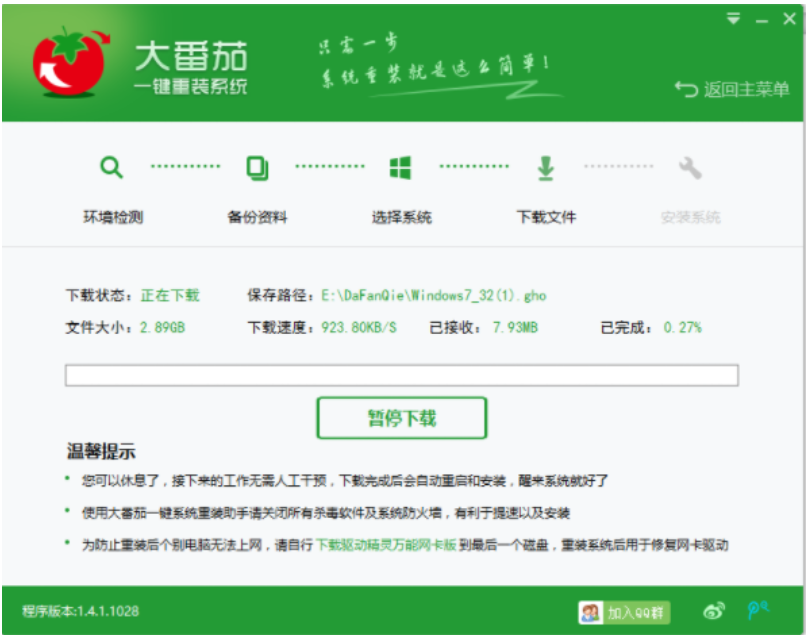 6、下載鏡像文件可能會花費較長時間,下載完成后大番茄會自動完成系統重裝,用戶可以離開電腦,等待軟件自動完成安裝即可。