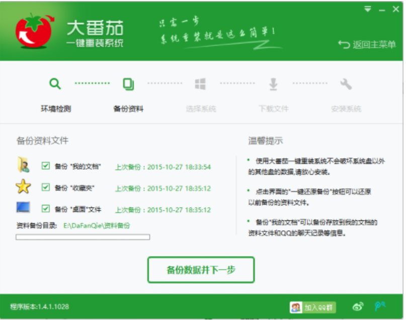 3、為防止資料丟失,建議全部勾選。備份后可以通過大番茄主界面右上角的“資料備份還原”對資料進行還原。