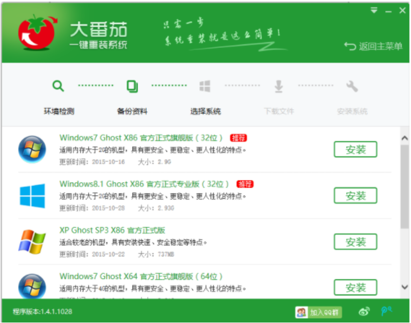 4、備份完成后點擊下一步進入“系統選擇”,大番茄已經根據電腦配置推薦了最合適的系統,選擇想要的系統點擊“安裝”進入下載界面。