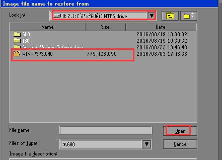 3、找到事先放在老白菜u盤中的ghost winxp系統鏡像,點擊“open”,如下圖所示: