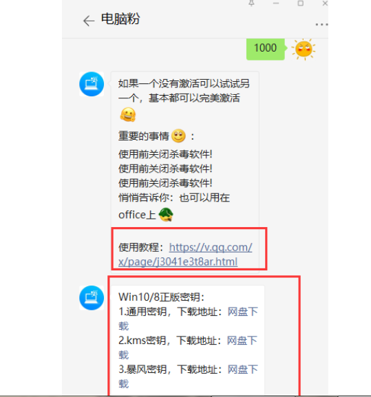 4、回到聊天界面,輸入對應的數字,即可獲取相應的激活工具及激活教程。