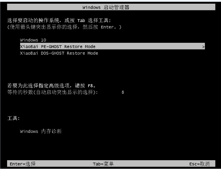 5、進入啟動管理器界面之后,選擇第二項xiaobai pe-ghost,按回車進入pe系統。