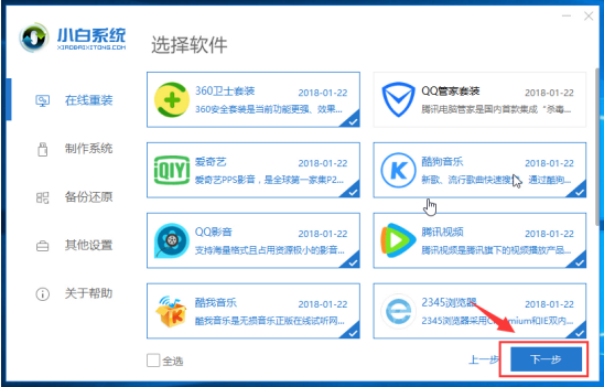 2、 選擇需要或不需要安裝的軟件,重裝完成后會自動安裝選擇的軟件,點擊下一步。