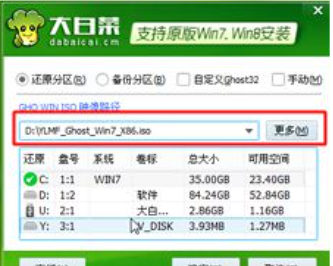 6、打開【大白菜一鍵裝機】,映像路徑選擇系統iso鏡像,提取gho文件,選擇gho文件。