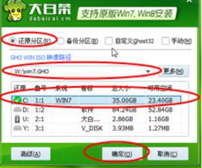 7、打開“還原分區”,選擇系統安裝至C盤,如果不是顯示C盤,根據“卷標”、磁盤大小選擇,點擊確定。