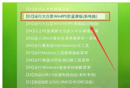 2、然后選擇出現的“運行大白菜win8pe防藍屏版”按下回車確認進入pe。
