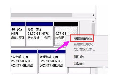 5、壓縮完成后,可看一個未分配的分區,右鍵點擊,選擇“新建簡單卷”。
