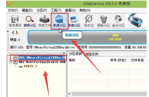 4、在打開的分區工具對話框中,選擇想要進行分區的硬盤,點擊“快速分區”然后進入下一步。