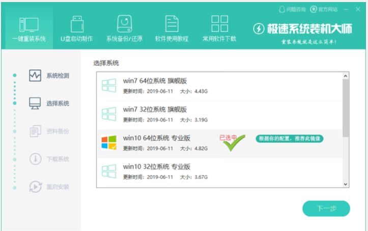 2、選擇系統。極速一鍵重裝系統已為您推薦適合電腦配置的系統版本,用戶也 可選擇XP,Win7,Win8或Win10,點擊"下一步"。