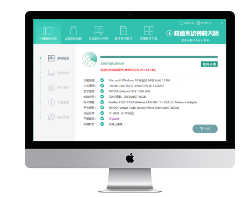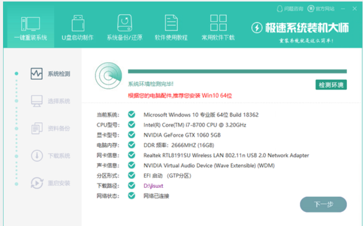 1、檢測系統。下載軟件完軟件后正常打開("極速一鍵重裝系統"), 程序會默認檢測當前系統環境,檢測完成后,點擊"下一步"。