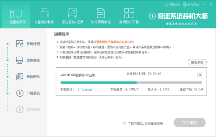 3、下載系統。到了這一步時用戶即可離開電腦,程序會全自動完成重裝步驟。為防止出現安裝失敗,用戶也可以選擇"U盤啟動制作"進行U盤裝機。