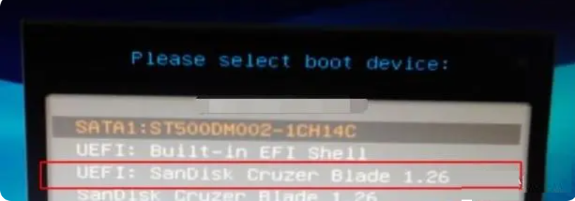 3.以下操作進入u盤啟動盤。將u盤插入計算機,插入需要重做系統的筆記本電腦pe啟動盤,重新啟動,不斷按壓F12或F11或Esc等待啟動快捷鍵。調整到啟動菜單提示框,選擇已識別的U盤選項,通常是U盤名稱或包含USB字樣,例如SanDisk,如果想uefi組裝模式,選擇帶UEFI按回車進入模式項。
