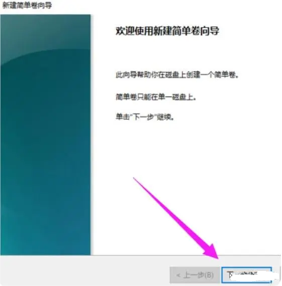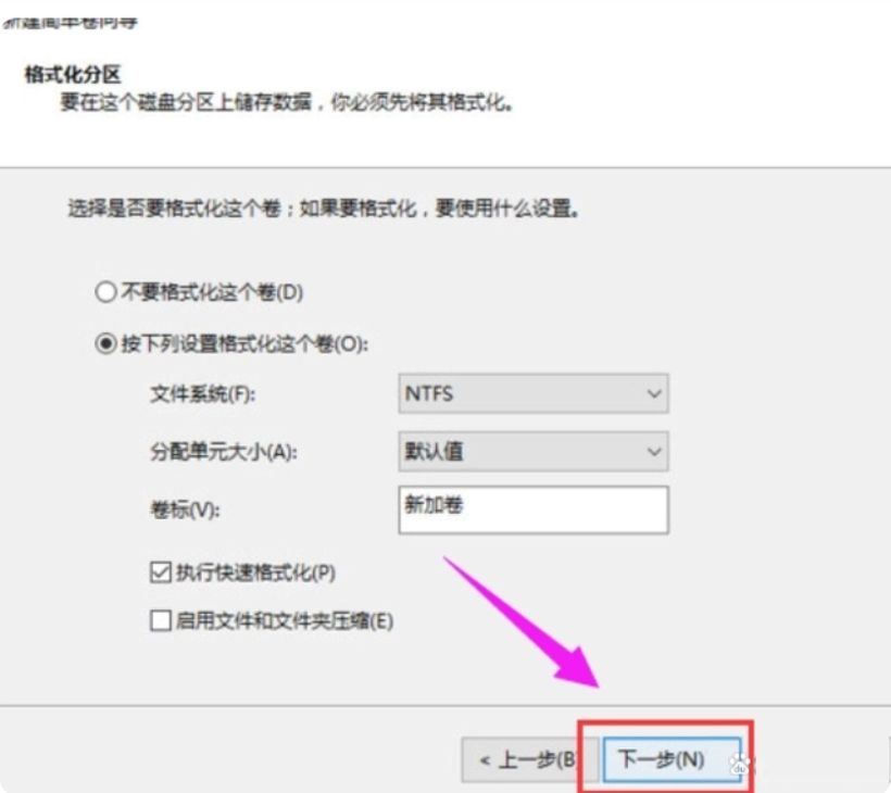 8.在這樣的頁面中,選擇硬盤的文件格式用于新建簡易卷,一般默認設置選擇?!癗TFS”可以,再一次“下一步”。