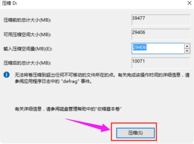 4、系統會計算出可以壓縮的空間,輸入必須壓縮的空間,點擊“縮小”按鍵。