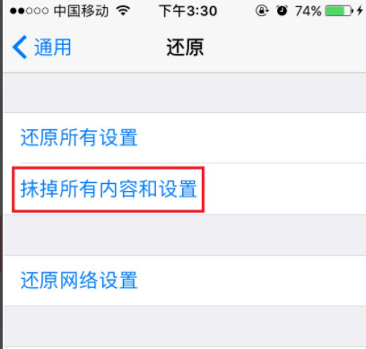 3、選擇還原里面的“抹掉所有 內容和設置”。