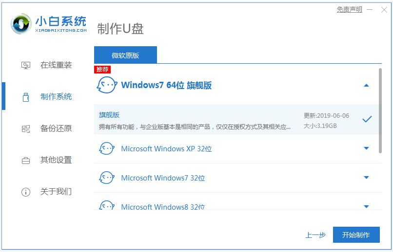 2、選擇我們需要安裝的windows系統,小編這里以win10系統為例,點擊開始制作啟動盤。