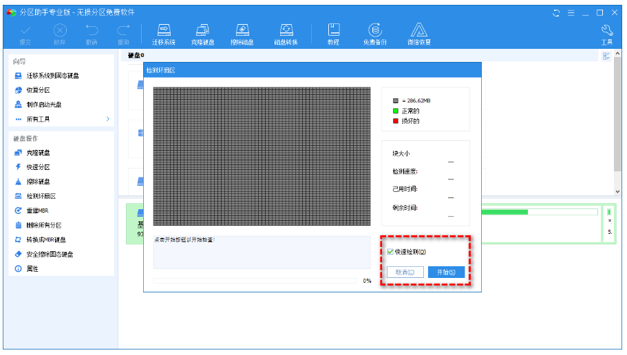 2. 在彈出窗口中勾選“快速檢測”選項,然后單擊“開始”以檢測所選硬盤驅動器上是否存在壞扇區。