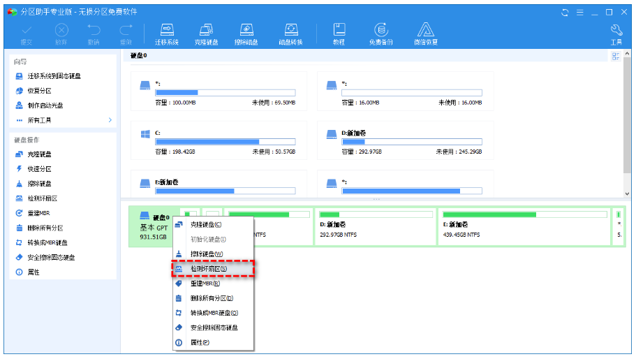 1. 打開傲梅分區助手,在主界面中右鍵單擊您想要檢測的硬盤,然后選擇“檢測壞扇區”。