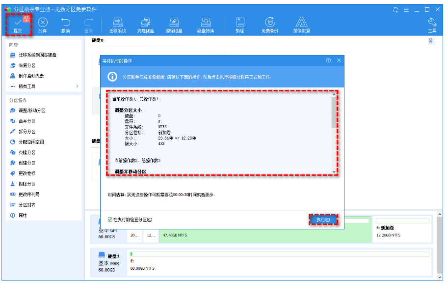 3. 返回主界面,單擊左上角“提交”按鈕以預覽即將進行的任務,確認無誤后單擊“執行”即可開始執行分配空閑空間任務以擴展分區大小。