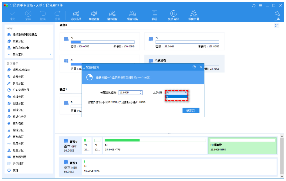 2. 在彈出窗口中選擇您想要分配多少空間給哪個分區,然后單擊“確定”。