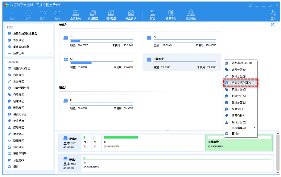 1.打開傲梅分區助手,在主界面中右鍵單擊同一硬盤中存在可用空間的分區,然后選擇“分配空閑空間”。