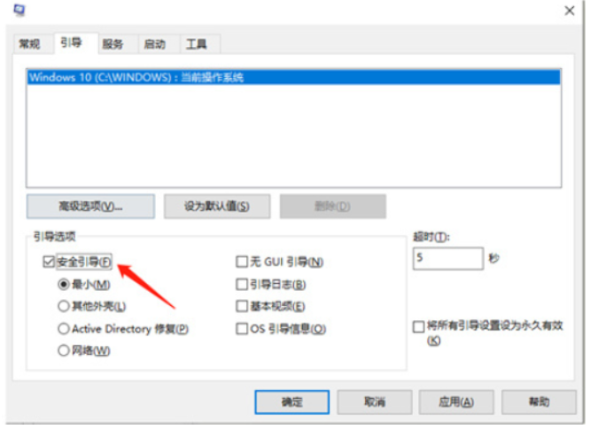 2、打開系統配置界面,選擇啟動選項,檢查安全啟動,然后單擊“確定”。等待電腦重啟后進入安全模式,在安全模式下使用防病毒軟件檢查并殺死病毒即可。