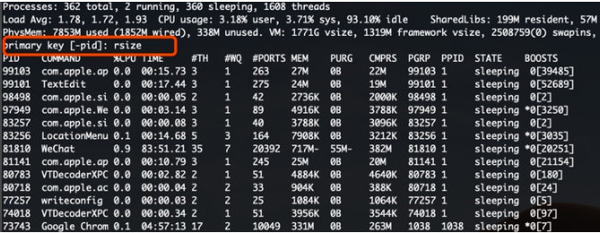 3、 然后按下字母“O”,接著輸入“rsize”即可查看到當前電腦內存占用排行。