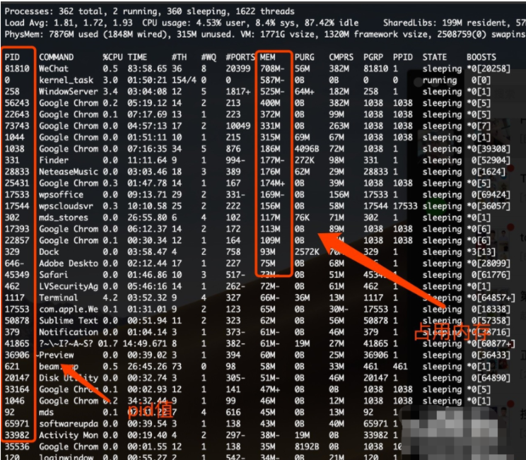 4、我們先記住占用內存高的軟件的“pid”值。