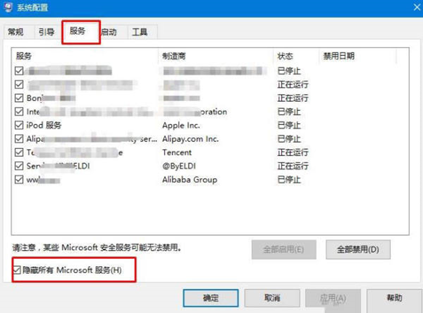 2、切換到“服務”選卡,勾選“隱藏所有 Microsoft 服務” 點擊【全部禁用】;