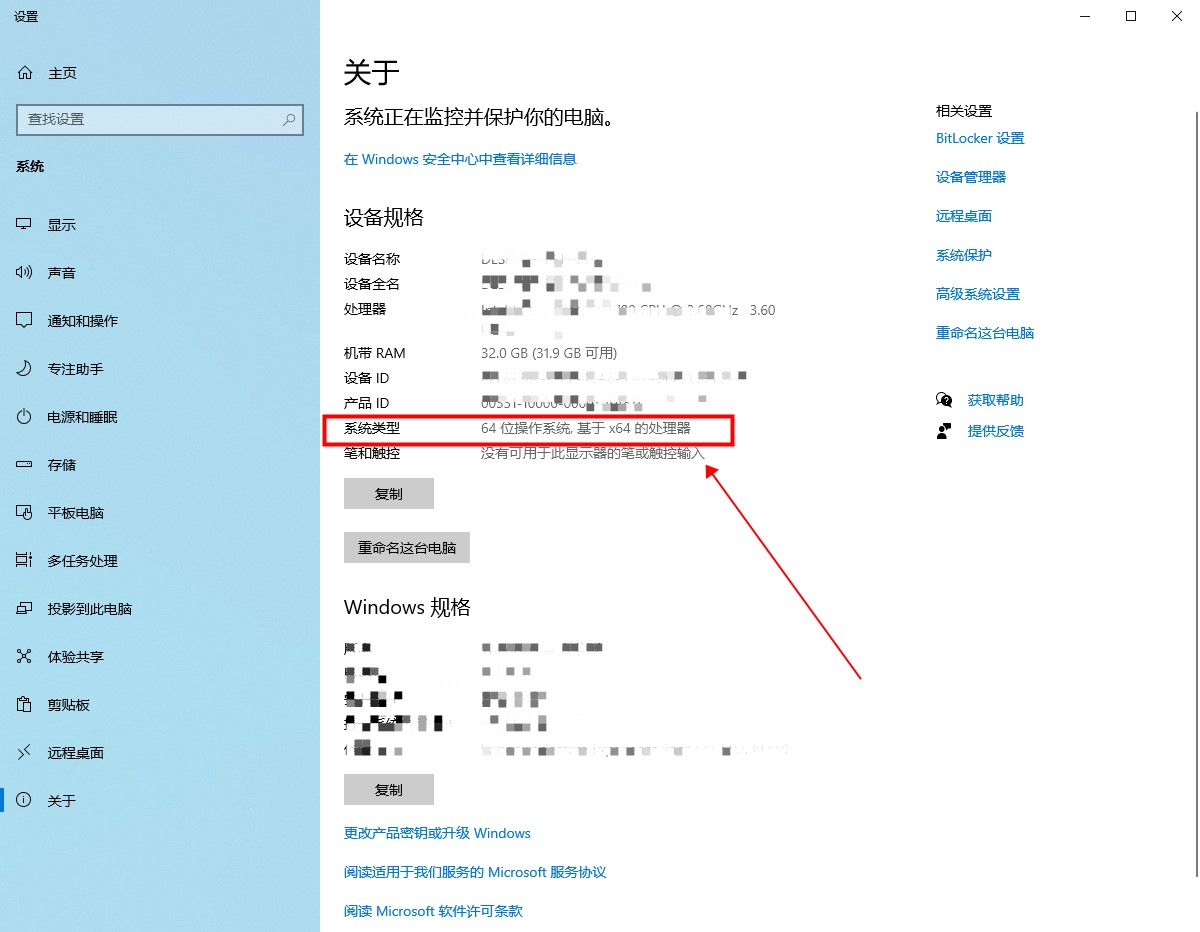 在關于中,可以看到電腦系統類型為64位操作系統以及其他的相關信息。