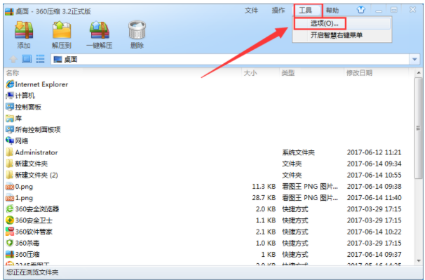 2、然后在360壓縮界面右上角的菜單中找到“工具”,點擊它后在彈出的選項中打開“選項”