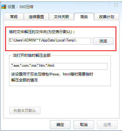 4、之后在“高級”界面就可以看到“臨時文件解壓的文件夾”所在位置了,點擊“瀏覽”即可修改該位置。