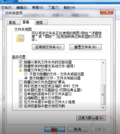 3.打開“文件夾選項”窗口,在高級設置中隱藏了已知文件類型的擴展,然后點擊確定。