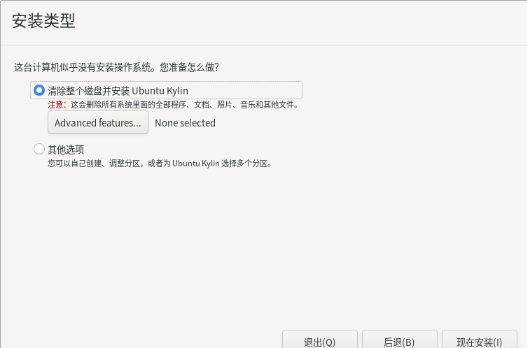 4.設置系統安裝類型。如需要全盤安裝,可直接選擇“清除整個磁盤并安裝Ubuntu Kylin ”,單擊“現在安裝”繼續。此處會彈出磁盤格式化警告框,選擇“繼續”即可。