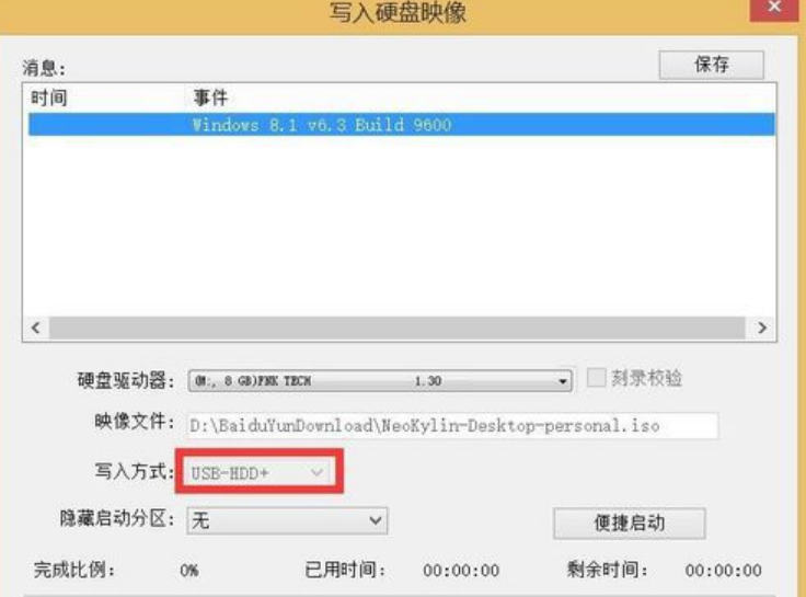 4.從打開的“硬盤定稿鏡像”窗口中,選擇“磁盤驅動器”列表中的“移動u盤”,同時將“寫入方式”設置為“USB-HDD”,然后單擊“寫入”按鈕,以建立運行移動u盤。