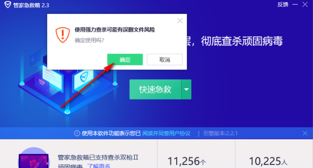 5、點擊之后,會出現一個【使用強力查殺可能會有誤刪文件風險】,點擊確定按鈕。