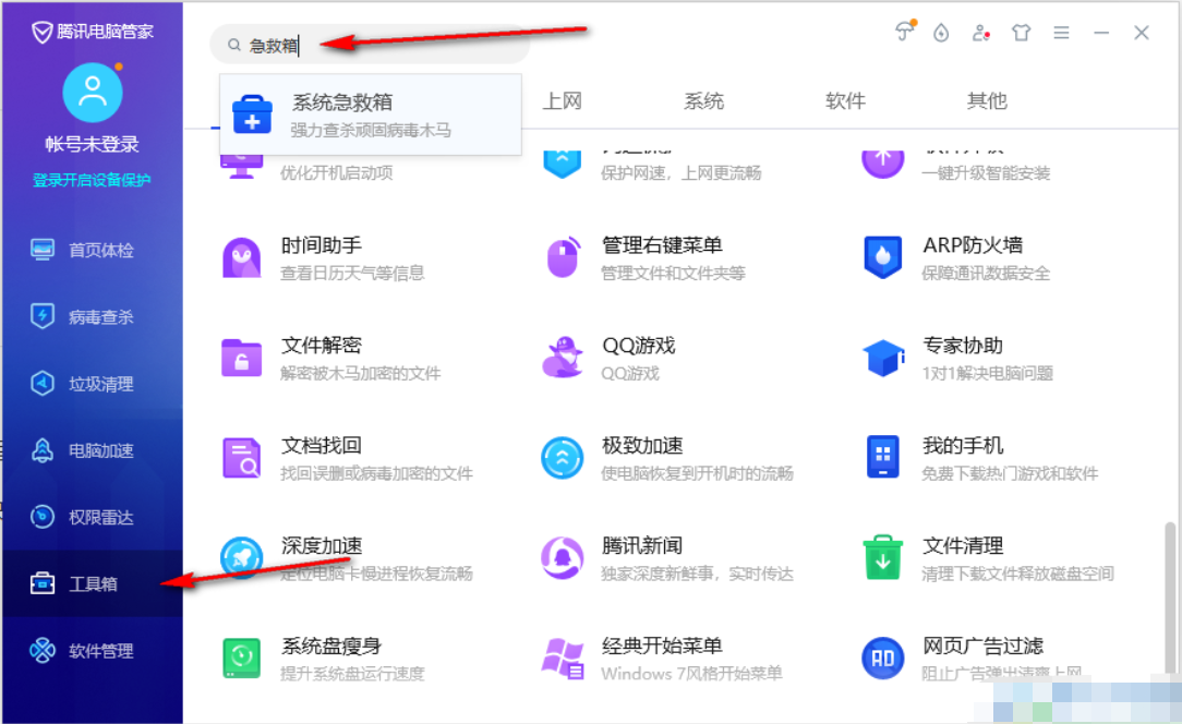 3、進入安全模式后就可以搜索電腦中的殺毒軟件,點擊【工具箱】,然后在頁面上方的搜索框中輸入【急救箱】,在出現的【系統急救箱】,點擊進入頁面。