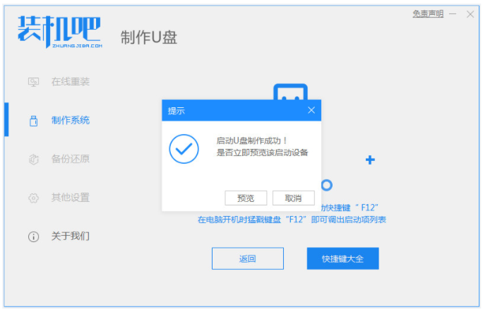 3、裝機軟件制作u盤啟動盤成功后,這時可先預覽需要安裝的電腦主板的啟動熱鍵,再拔除u盤退出。