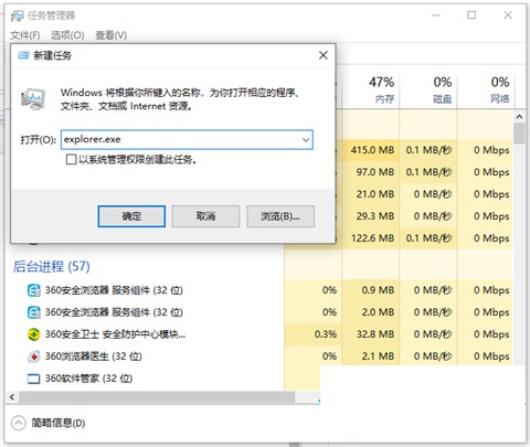 3、接著輸入explorer.exe確定。等待系統重啟就可以正常使用了。