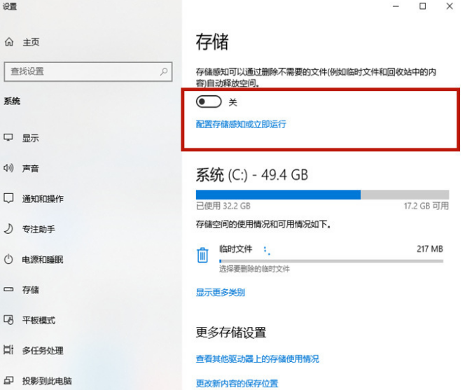 3、將存儲開關打開,然后點擊進入【配置存儲感知或立即運行】;