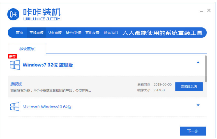 1、首先在電腦上下載安裝卡卡安裝工具并打開,選擇我們需要安裝的系統版本,點擊下一步。
