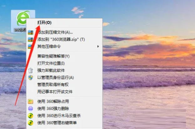 2、右擊“360瀏覽器”,然后選擇“打開”。